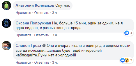 Судя по сообщениям, огни наблюдали в Приволье и разных районах Лисичанска. Как пишут пользователи, вереница из нескольких десятков огней плывет по небу в течение примерно 15 минут.