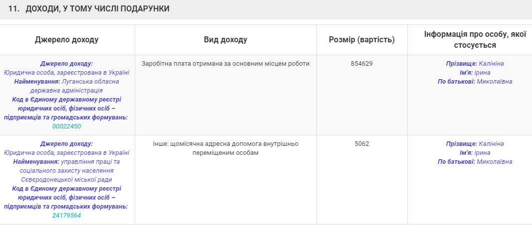 В ежегодной декларации за 2019 год, поданной 13 марта 2020 года, Калинина указала 854 629 грн. зарплаты по основному месту работы. Также она получила 5062 грн. помощи как внутренне перемещенное лицо. Из имущества у чиновницы - квартира в Луганске площадью 55,7 кв. м, стоимостью 109 299 грн. На банковских счетах - 20 тыс. долларов и 73 тыс. грн.