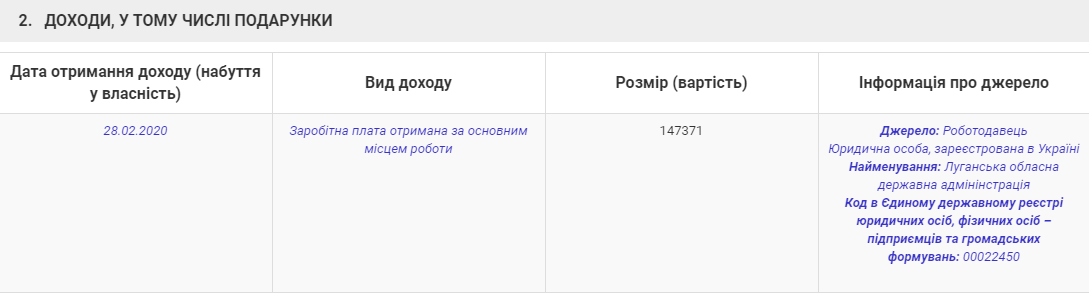 Зарплата Калининой в феврале 2020 года была выше, чем у главы ЛОГА Сергея Гайдая и его заместителя Екатерины Безгинской, сообщает Час Пик.