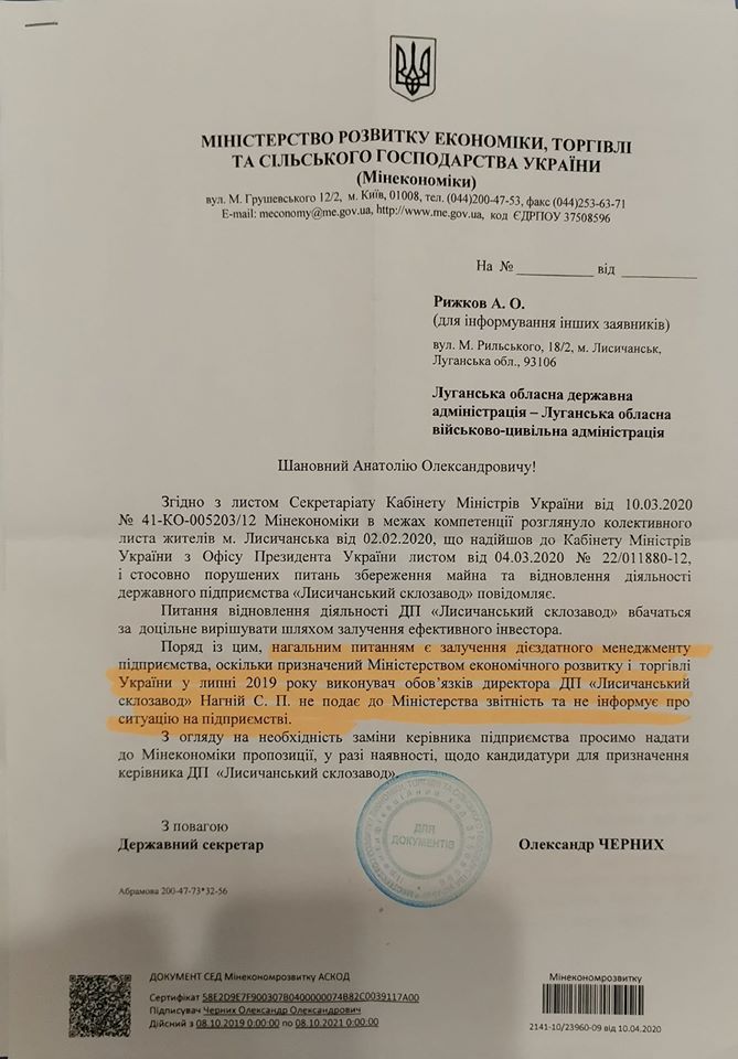 Также в министерстве пожаловались на то, что назначенный в июле 2019 года и.о. директора ГП "Лисичанский стеклозавод" Нагний С.П. не подает отчетность и не информирует о ситуации на предприятии.