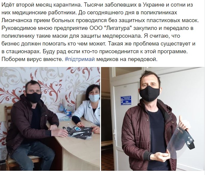 Акцию поддержал Дмитрий Михайлов, директор ООО «Лигатура». «Идёт второй месяц карантина. Тысячи заболевших в Украине и сотни из них медицинские работники. До сегодняшнего дня в поликлиниках Лисичанска прием больных проводился без защитных пластиковых масок. Руководимое мною предприятие ООО "Лигатура" закупило и передало в поликлинику такие маски для защиты медперсонала. Я считаю, что бизнес должен помогать кто чем может» - написал он в соцсети.