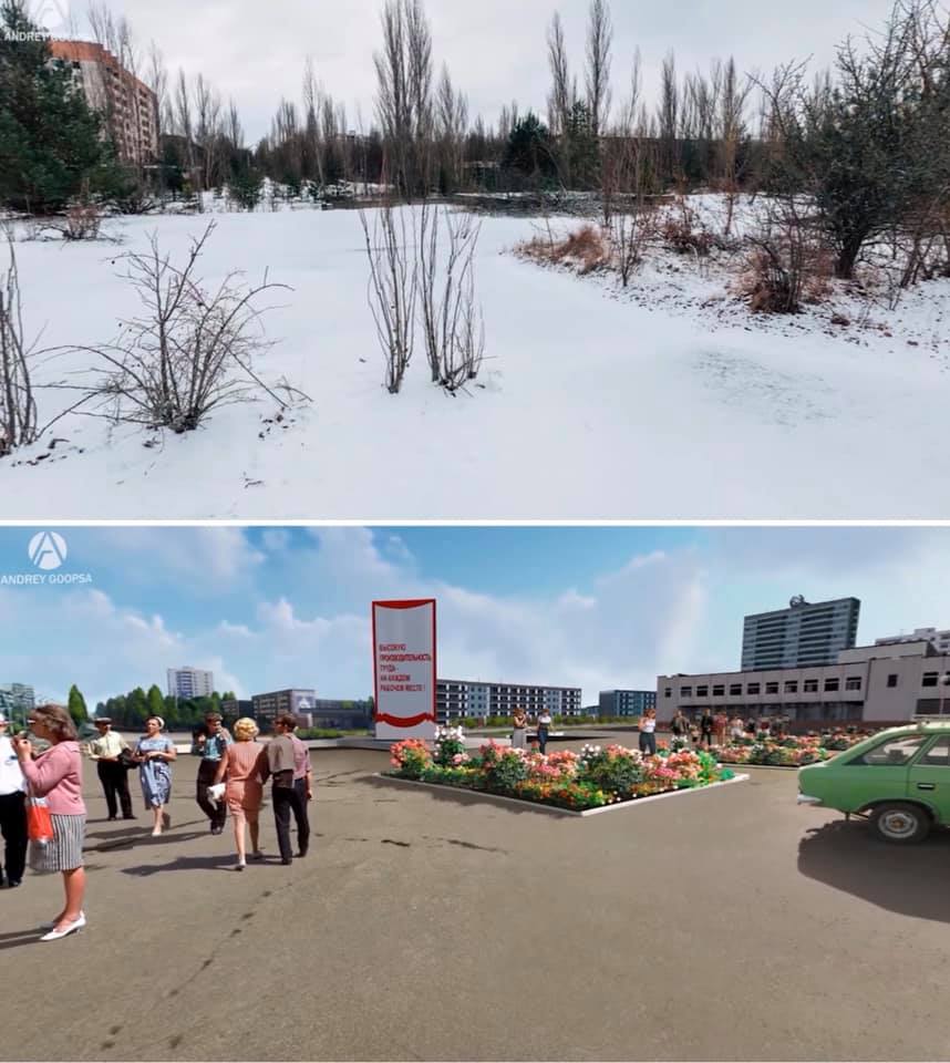 На реалистичных изображениях, созданных дизайнерами, Припять - благополучный развивающийся город, в котором работают магазины, кинотеатр, отель, люди гуляют на улицах и радуются жизни.