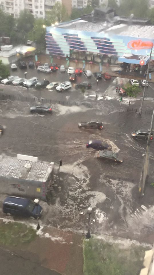 Днем 4 мая на столицу Украины обрушился мощный ливень с грозой, в результате чего на улицах образовались реки.