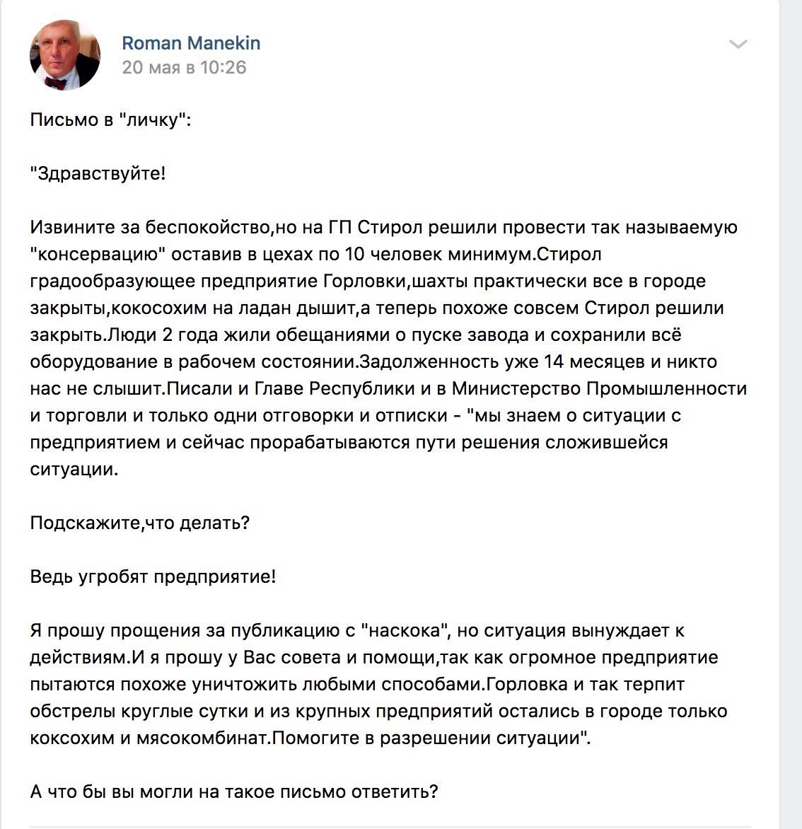 Журналист Денис Казанский поделился в соцсети скриншотом со страницы пропагандиста Романа Манекина, который выложил на всеобщее обозрение "крик души" горловчан.