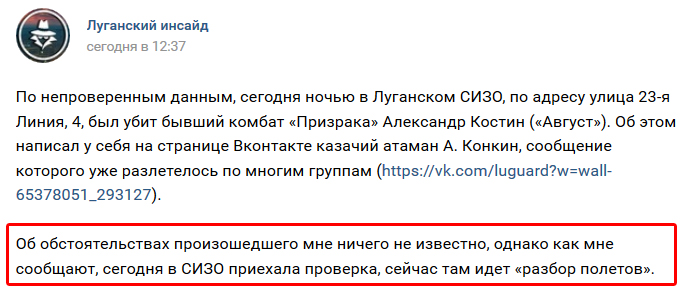 Тела человек не видел, просто пересказал. Пока не могу быть уверен на 100%, что Костин действительно мертв. Но если это так, в течении нескольких часов будет подтверждение. Если этот так, то выходит, что очередного "героя новороссии" запытали свои же собраться по русскому миру