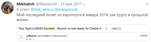 В сети все еще доступен Твиттер-аккаунт Донецкого аэропорта им. Прокофьева, который не обновлялся с 2014 года. Один из последних твитов на этой странице украинцы с болью репостят из года в год.