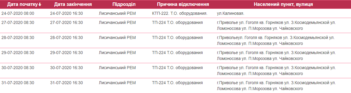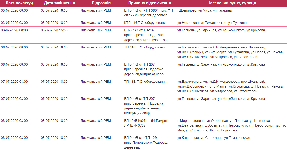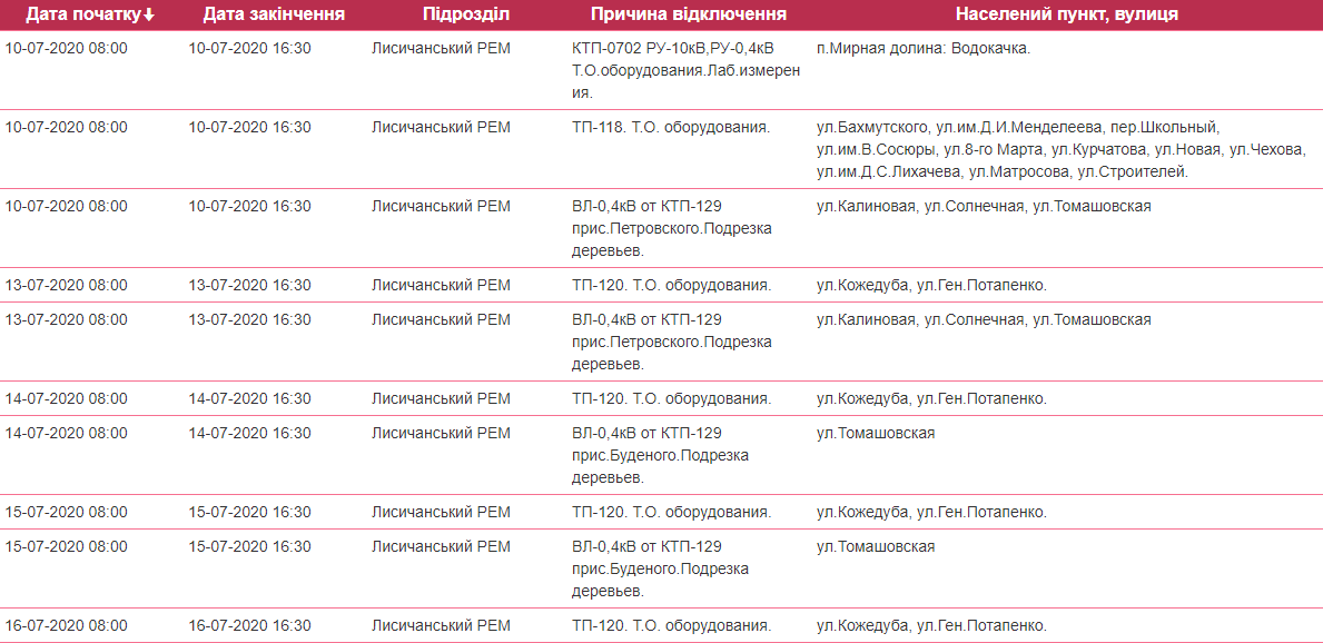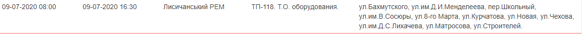 В зоне обслуживания Лисичанского РЭС будут производиться отключения электроэнергии в ряде районов г. Лисичанска, п. Шепилово, п. Волчеяровка, п. Мирная Долина, г. Приволье (подробности в таблице ниже).