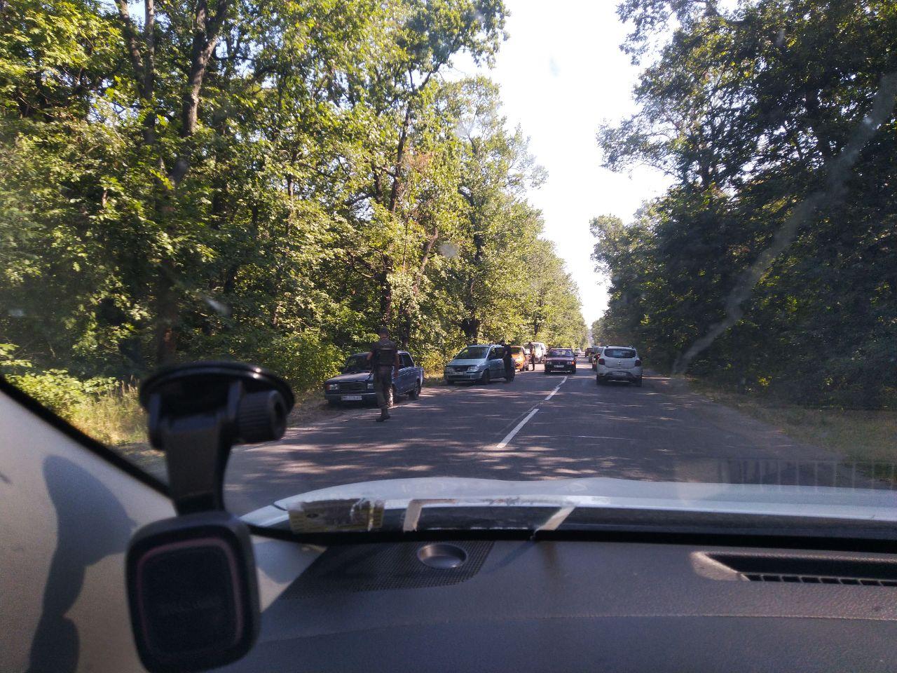 Проверку проводят около десятка правоохранителей - стоят две полицейские машины, причем останавливают транспорт, который двигается в обе стороны. По словам водителей, проверяют документы, салон и багажник. Причину остановки не называют. У полицейских - шевроны батальона "Херсон".