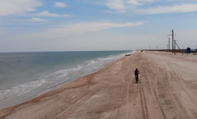 Затем путешественники отправились в сторону острова Бирючий и обнаружили там отличный пляж, на котором абсолютно никого нет. Благодаря отсутствию людей, море там чистое и прозрачное, видно дно и медуз. По просторному пляжу с белым песком можно прокатиться на велосипеде или просто от души побегать.