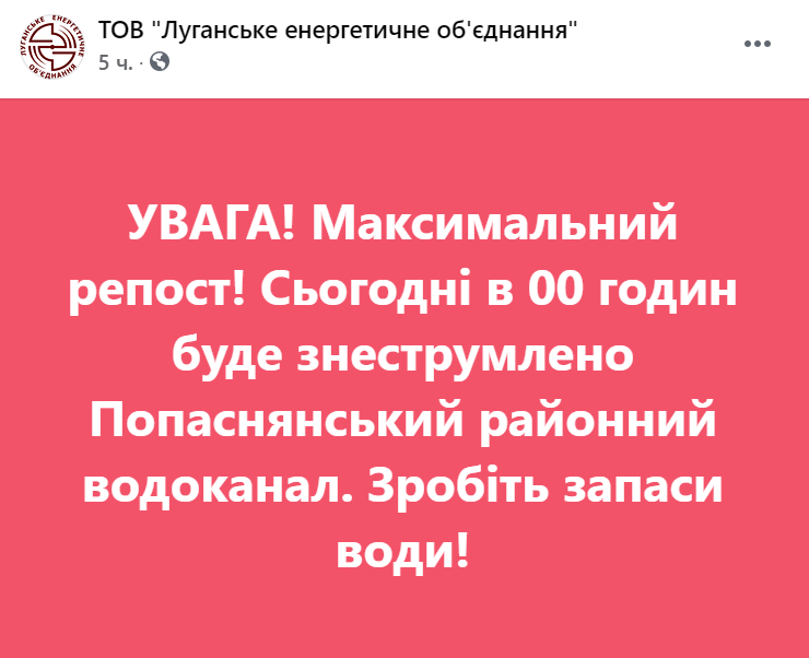 "Сегодня в 00 часов будет обесточен Попаснянский районный водоканал. Сделайте запасы воды!" - говорится в сообщении.