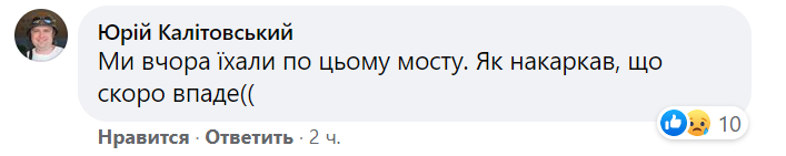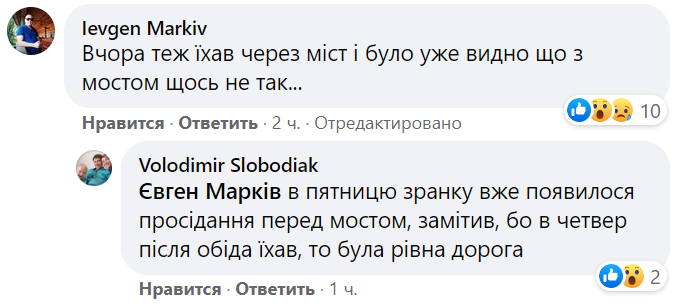 В комментариях в Фейсбуке пользователи, которые в последние дни ездили по этому пути, пишут, что при поездке заметили проседание моста. По словам очевидцев, мост перед обрушением пошел "волнами".