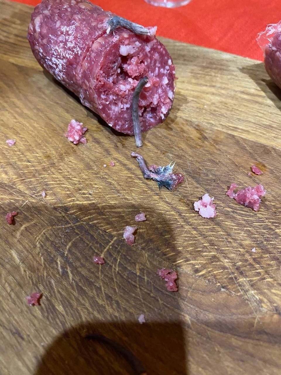 В доказательство своих слов мужчина опубликовал видео и фото колбасы. На снимках видно, что в колбасе были лапки с шерстью и большая часть хвоста.