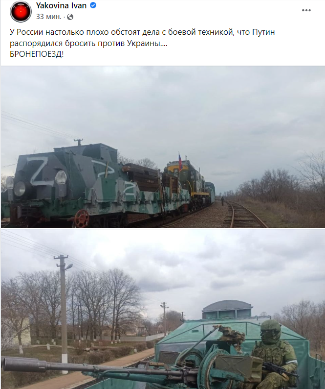 "Россия извлекла из глубокого резерва времен противостояния на границе СССР и Китая бронепоезд. Тот самый, что "стоял на запасном пути", - говорится в публикации в местном Фейсбук-сообществе.