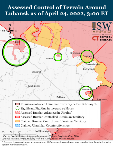 24 апреля на Донбассе оккупанты провели несколько атак вокруг Северодонецка, Попасной и Марьинки, добившись ограниченных успехов.