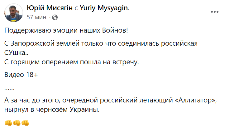 Кроме того, народный депутат Юрий Мысягин сообщает в Фейсбуке, что "за час до этого очередной российский летающий «Аллигатор» нырнул в чернозём Украины" (очевидно, имеется в виду вертолет Ка-52).