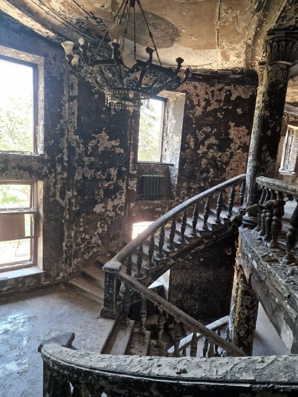 На обнародованных фото видно, что от одного из самых красивых зданий города практически ничего не осталось. Внутри здания, на уцелевших его частях, - следы пожара. Зато на разбитом фасаде оккупанты не забыли нарисовать "флаги" "ДНР".