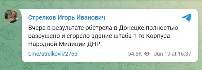 "Вчера (18 июня – ред.) в результате обстрела в Донецке полностью разрушено и сгорело здание штаба 1-го Корпуса Народной Милиции ДНР", - написал Гиркин в Телеграм.