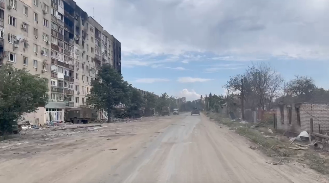 На видео показано, что каждый дом имеет серьезные разрушения, поэтому не пригоден для жизни. Дорога разбита. Вместо автомобилей по ней ездит военная техника.