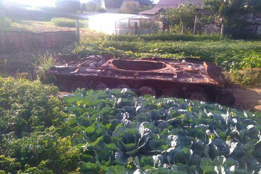 Сеть облетели фотографии из села Великая Дымерка Киевской области, на которых сожженный российский танк соседствует с аккуратными грядками.