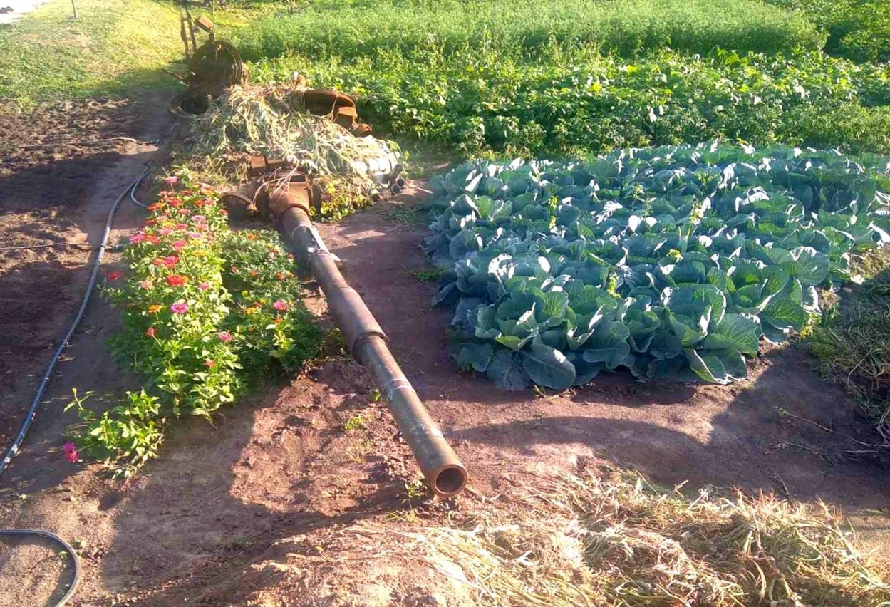 Полиция не успела забрать остатки российского мусора, и хозяева посадили вокруг танка капусту, картошку и цветы. Оторванную башню приспособили под компостную тару.