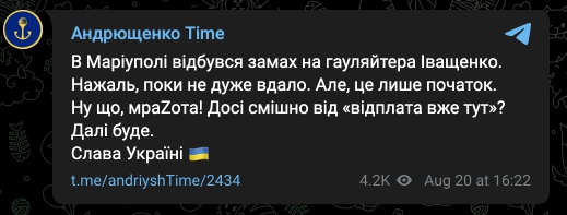 "В Мариуполе произошло покушение на гауляйтера Иващенко. К сожалению, пока не очень удачно. Но, это только начало", - написал он.