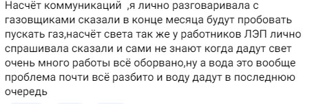 "Насчет коммуникаций, я лично разговаривала с газовщиками сказали в конце месяца будут пробовать пускать газ, насчет света так же у работников ЛЭП лично спрашивала, сказали и сами не знают когда дадут свет очень много работы все оборвано, ну а вода это вообще проблема почти все разбито и воду дадут в последнюю очередь", - пишет жительница города.