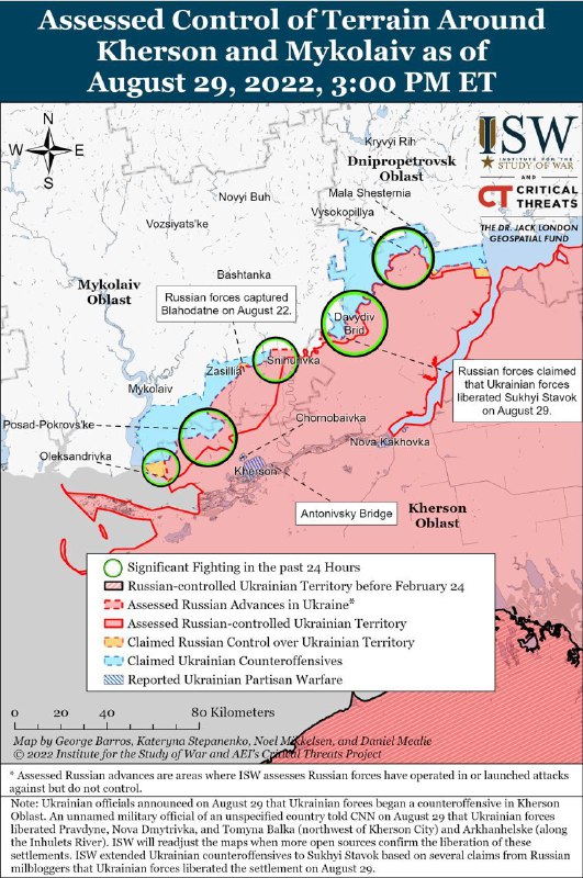В Институте изучения войны отмечают, что "информацию в ближайшее время будет сложно проверять. Несмотря на активизацию украинских военных, оккупанты также пытались штурмовать на северо-западе Херсонской области".