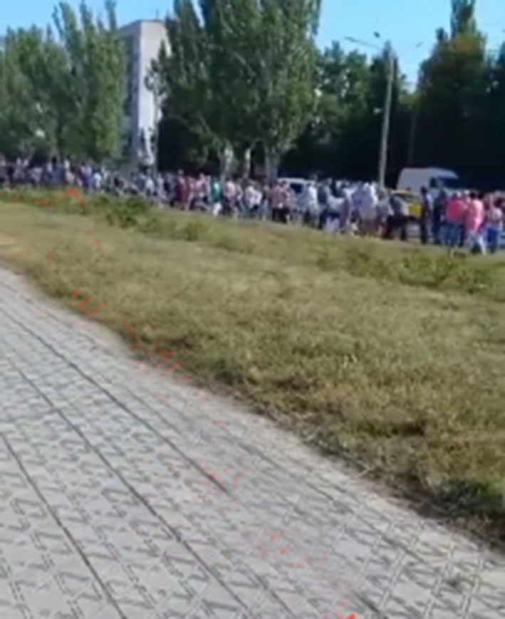 На кадрах видно, что очередь начинается в районе бывшего кинотеатра "Родина" и заканчивается около бывшего магазина "Фортуна".