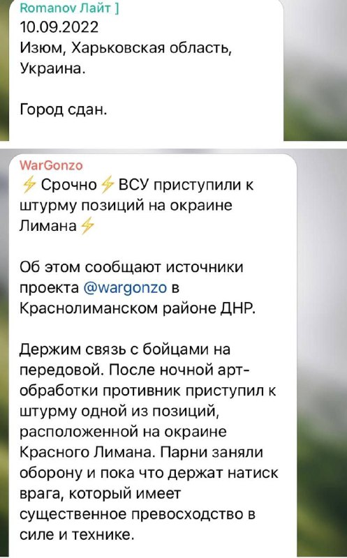 Ранее пророссийские Telegram-каналы сообщили, что ВСУ зашли в Изюм. "Начался штурм Лимана".