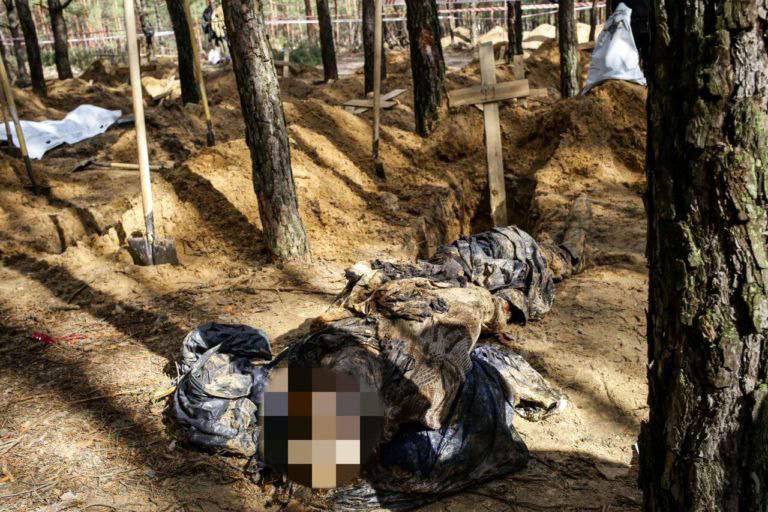 В Изюме Харьковской области следствие эксгумировало тело гражданского мужчины со следами пыток. После словам судмедэксперта, который провел визуальный осмотр тела, оккупанты связали мужчине руки за спиной, после чего отрезали ему мошонку.
