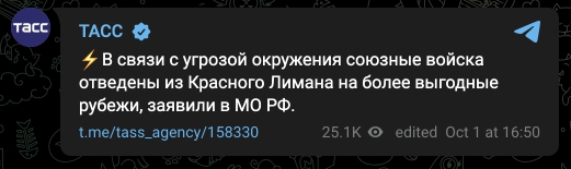 "В связи с созданием угрозы окружения союзные войска были отведены из Лимана на более выгодные рубежи", - говорится в сообщении.