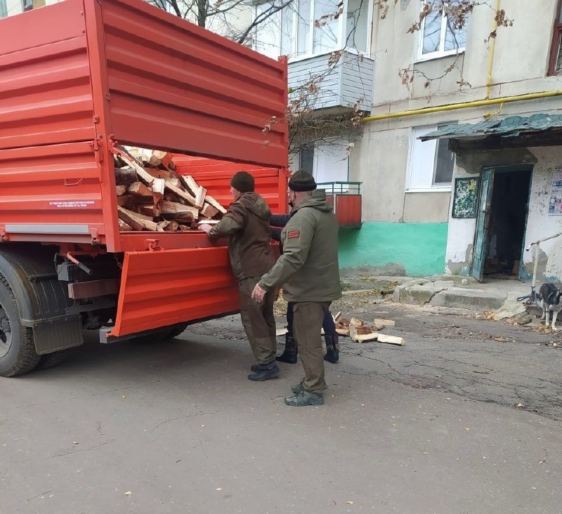 На кадрах так называемый и.о. главы "администрации" Лисичанска Андрей Скорый со своими подопечными разгружают дрова во дворах многоэтажных домов.