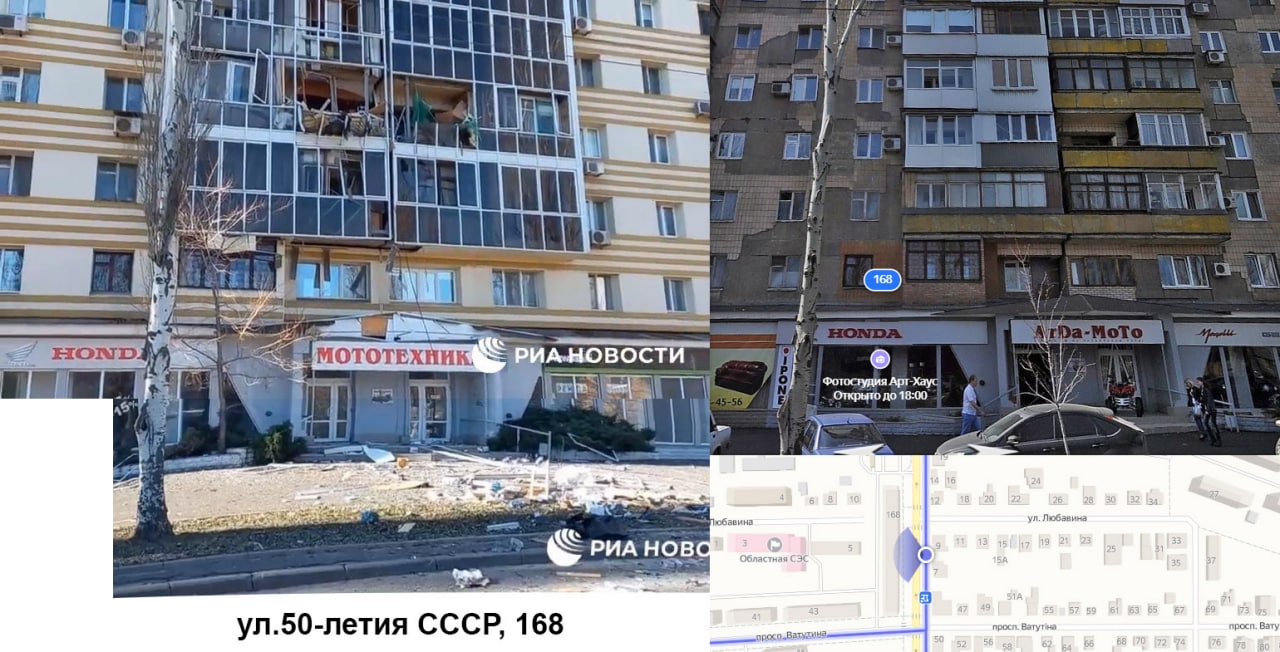 Пример прилета мины в восточную сторону многоэтажки. Со стороны позиций ВСУ мина туда никак прилететь не могла физически.