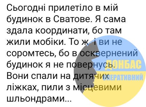 "Сегодня прилетело в мой дом в Сватово. Я сама сдала координаты, потому что там жили мобики. Поэтому и вы не стесняйтесь, так как в оскверненный дом я не вернусь", - написала местная жительница.