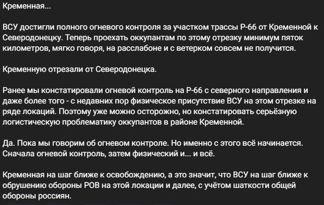 ВСУ достигли полного огневого контроля за участком трассы Р-66 от Кременной к Северодонецку Луганской области.