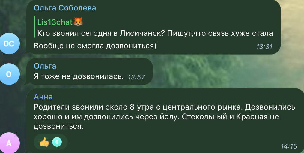 В региональных чатах в Telegram пользователи сети сообщают о том, что в Лисичанск стало очень трудно дозваниваться, передает Час Пик.