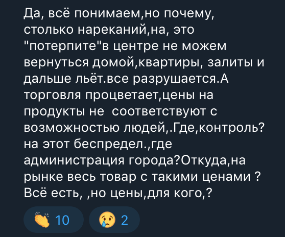 Пользователи сети отмечают, что в сегодняшней ситуации не могут вернуться домой, так как условия жизни в Лисичанске катастрофичны. Дома продолжают разрушаться. Вместе с тем, торговля процветает, цены на продукты не по карману местным жителям. "Простые смертные" люди не понимают, откуда на рынке столько товаров по неадекватным ценам.