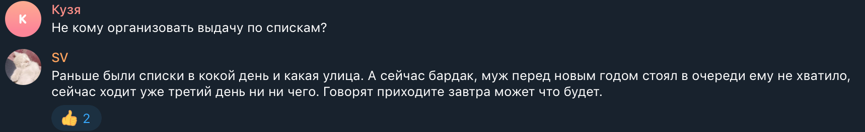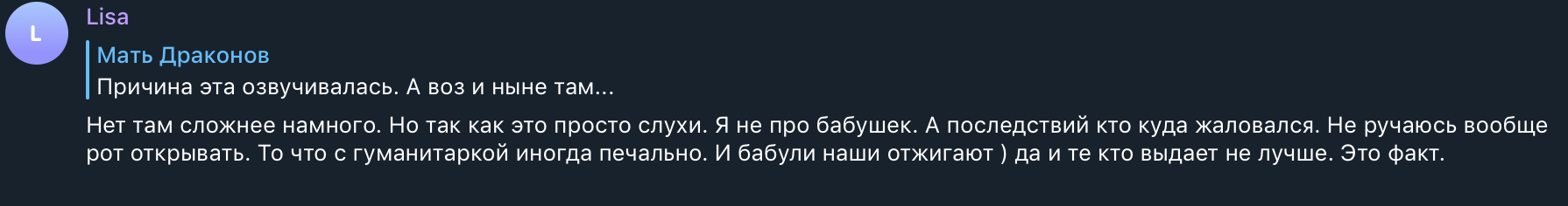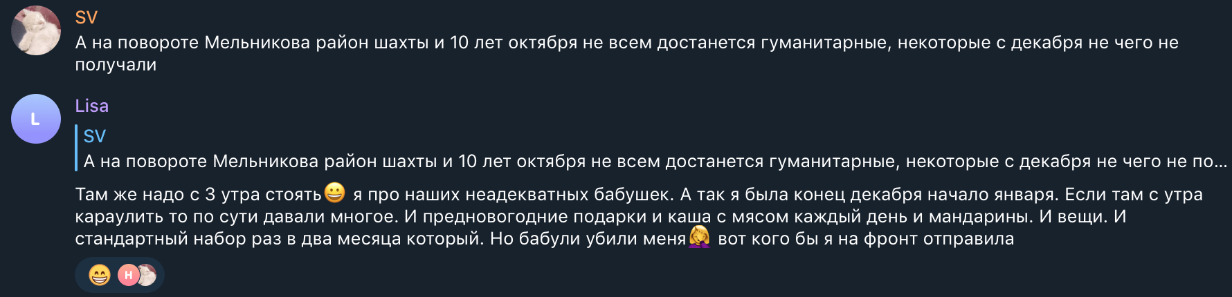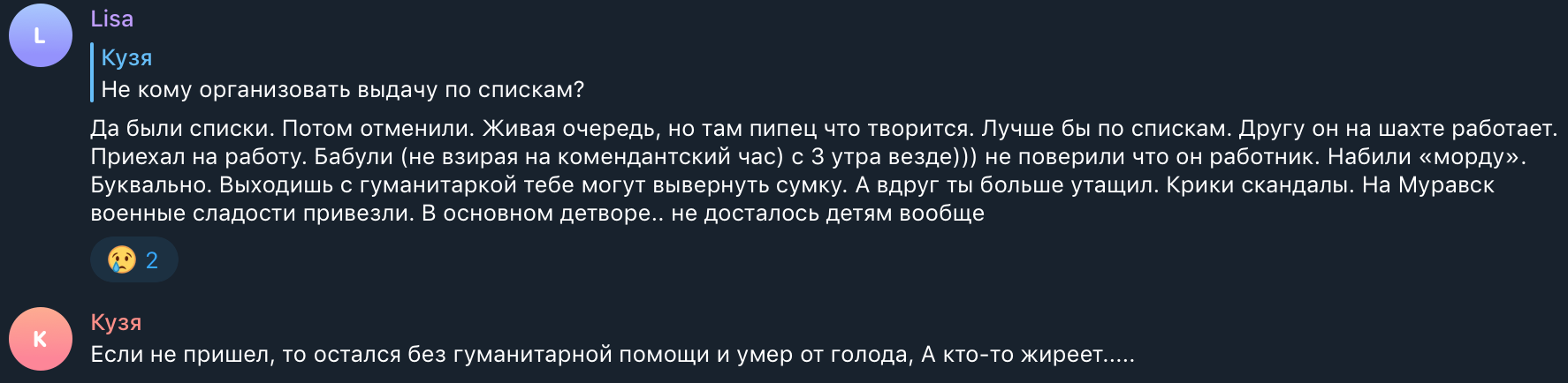 По словам пользователей сети, получить гуманитарную помощь в Лисичанске не так просто. Люди вынуждены едва ли драться из-за куска хлеба. Организовать выдачу гуманитарки по спискам просто некуму. Выстаивать в очередях с 3 ночи могут не все.