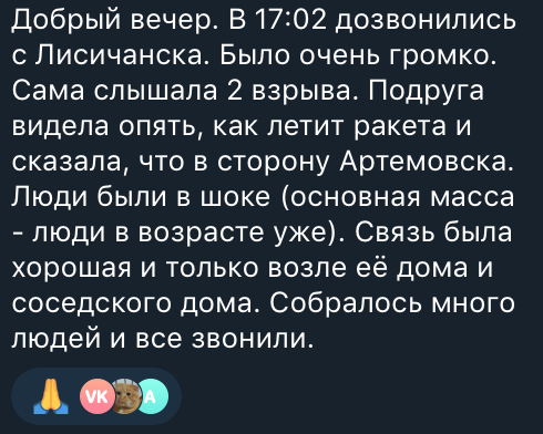 По словам пользователей сети, которым удалось выйти на связь с Лисичанском, в городе "было очень громко". Звуки взрывов слышно было даже в трубке телефона. Местные жители утверждают, что видели, как пролетает снаряд.