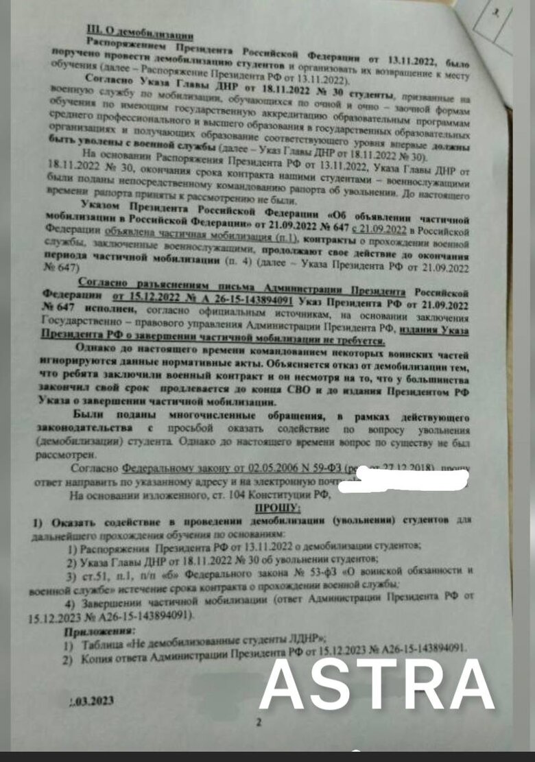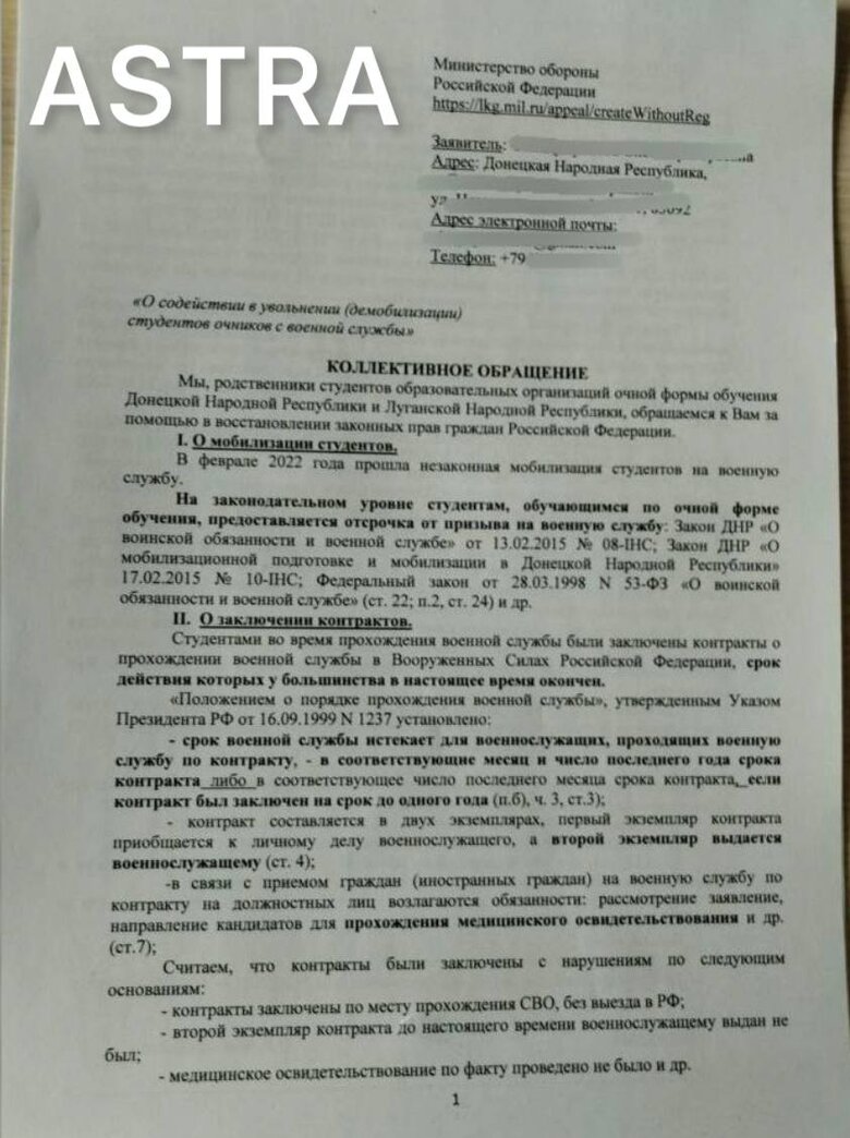 В обращении говорится о студентах дневной формы обучения с оккупированных территорий Донецкой и Луганской областей, которых в феврале 2022 года "мобилизовали" в Вооруженные силы РФ.