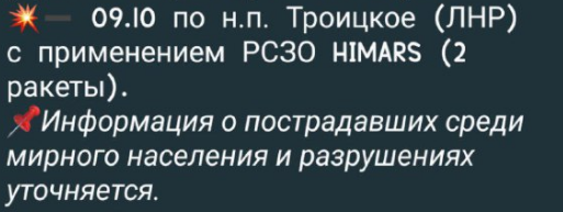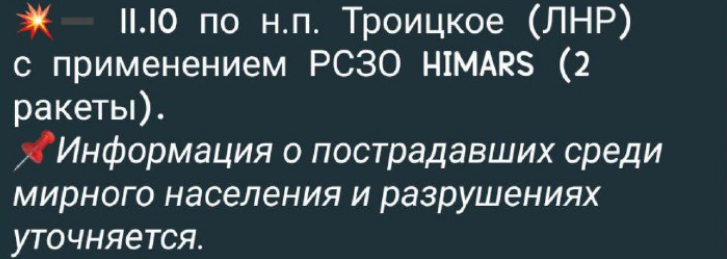 "В 09.10 и в 11.10 по н.п. Троицкое с применением РСЗО HIMARS (2 ракеты). Информация о пострадавших среди мирного населения и разрушениях уточняется", - говорится в сообщении.