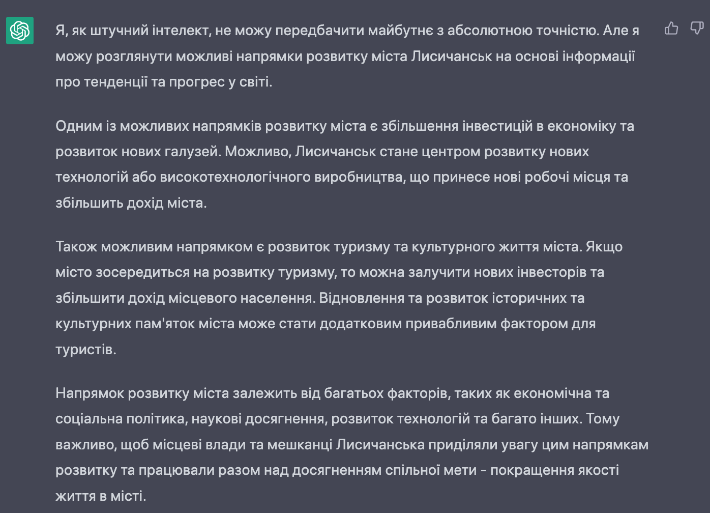 Искусственный интеллект "предупредил", что предвидеть точное развитие событий не может, однако на основании общемировых тенденций очень емко ответил на вопрос: "Каким ты видишь Лисичанск в будущем?".