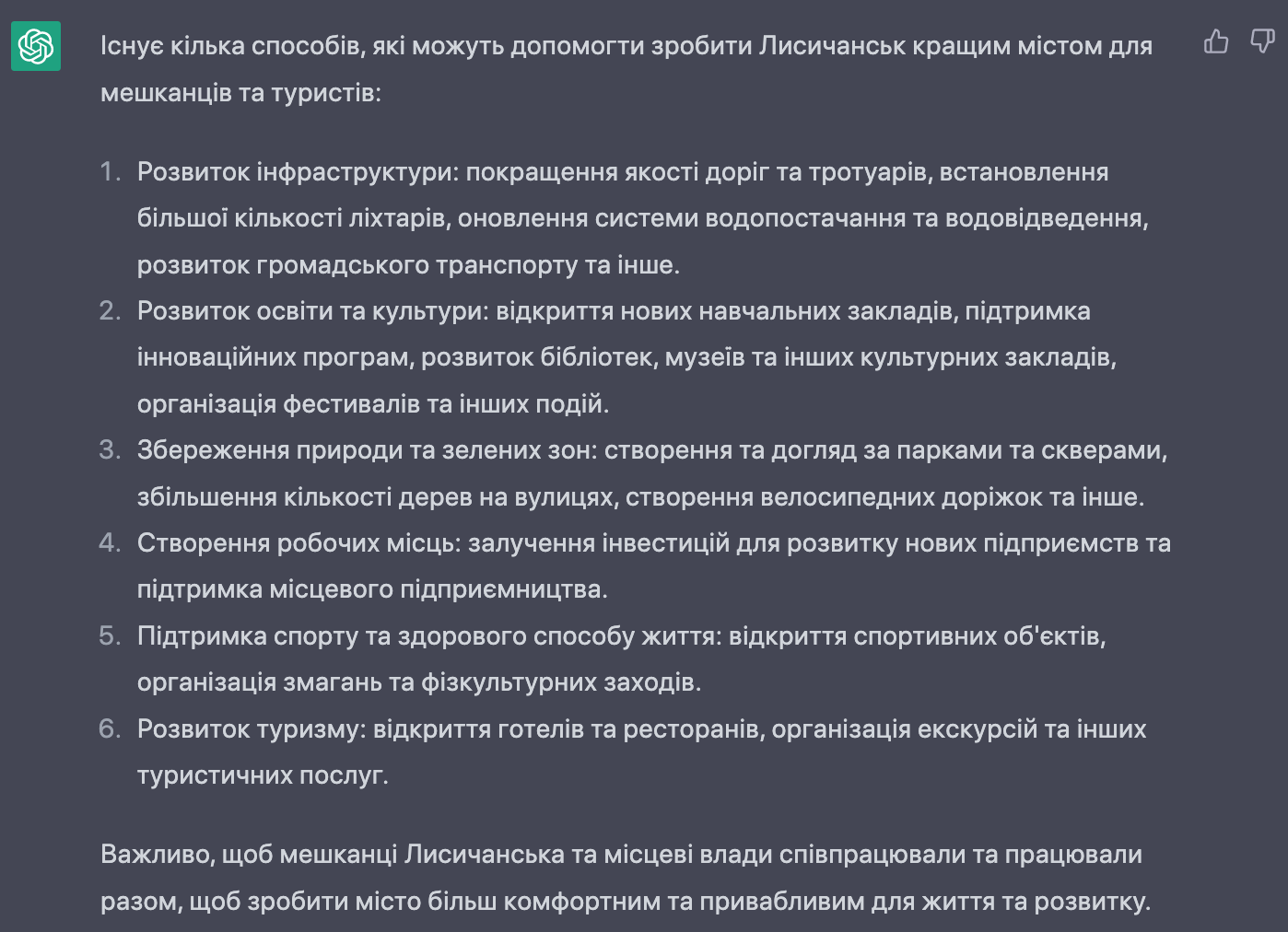 Также Час Пик поинтересовался у искусственного интеллекта, как можно сделать Лисичанск в будущем лучше. Ответ очень обширный. Он включает развитие инфраструктуры, образования, сохранение природы, поддержку спорта и здорового образа жизни, а также - туризма, который, по мнению нейросети, должен иметь отношение к городу.