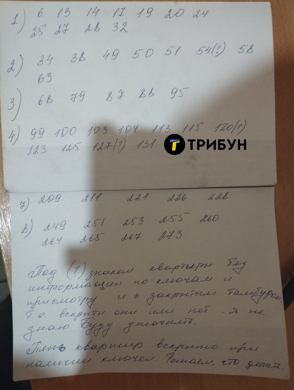 "Под знаком (?) квартиры без информации по ключам и присмотру, и с закрытым тамбуром, т.е. неизвестно вскрыты они или нет. Пять квартир вскрыты при наличии ключей. Решаем, что делать", - подпись под списком квартир.