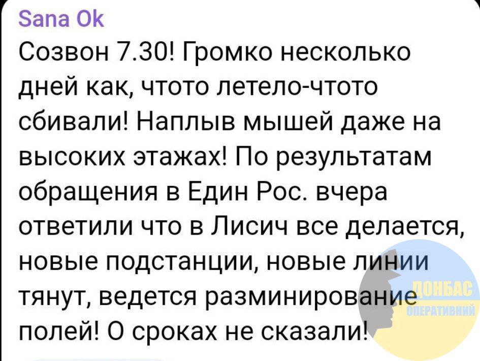 По словам местных, в Лисичанске "громко" несколько дней подряд - "что-то летит, а что-то сбивают". Наблюдается наплыв мышей в многоквартирных домах.