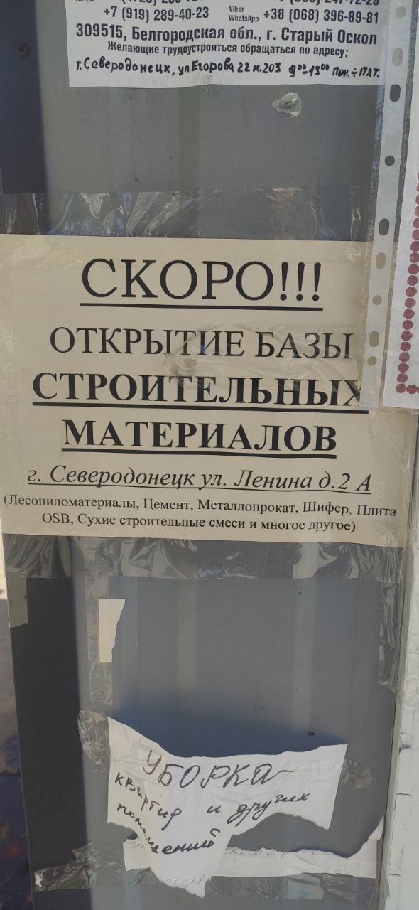 Рядом с объявлением об открытии базы строительных материалов, кто-то предлагает свои услуги по уборке квартир и других помещений.
