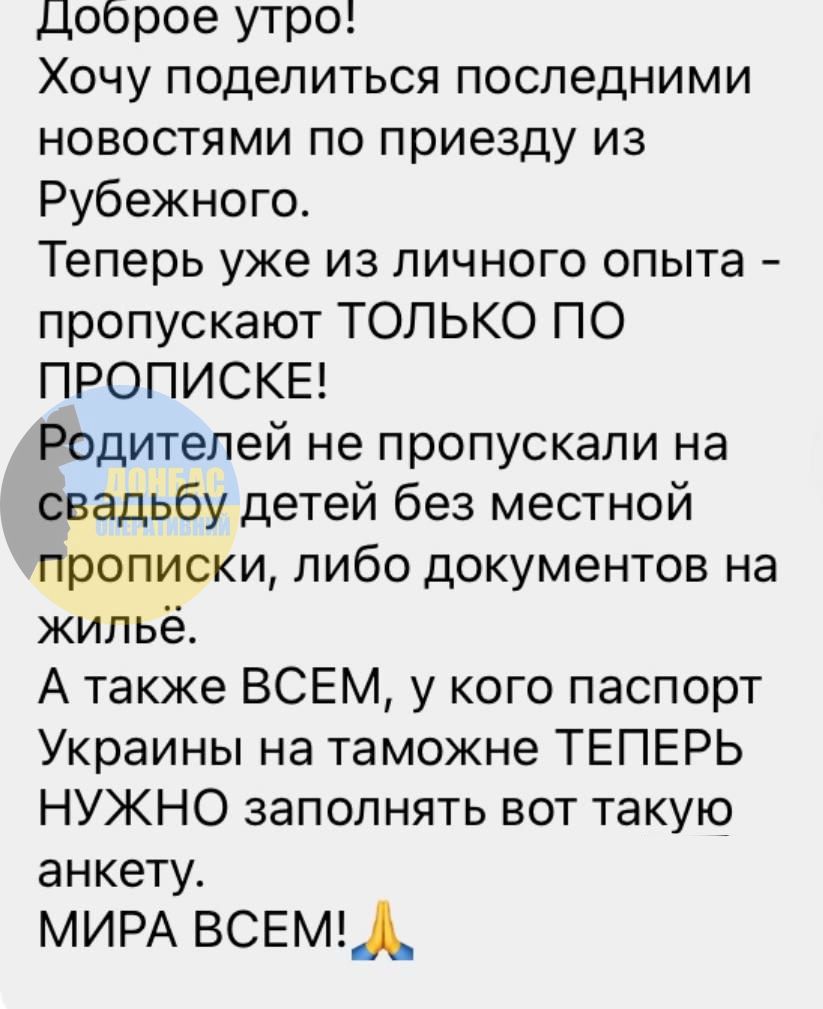 Кроме того, все граждане, у которых имеется украинский паспорт, при выезде из так называемой "ЛНР", обязаны заполнять специальную "анкету" при прохождении таможенного контроля . Таким способом оккупанты собирают подробную личную информацию о гражданах. В частности, "анкета" содержит и такие провокационные вопросы, как "Отношение к России", "Наличие родственников в ведомствах и силовых структурах силового блока Украины". А также вопрос о наличии знакомых или личной причастности к ВСУ.