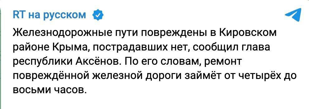 Местные паблики пишут, что из-за подрыва железной дороги задерживаются два пригородных поезда и два поезда дальнего следования №028А "Москва- Симферополь" и №180С "Евпатория-Санкт-Петербург". Пассажиров поездов будут доставляться из Владиславовки в Ленин и обратно автобусами.
