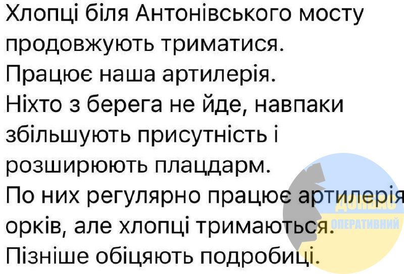 На Херсонском направлении продолжаются боевые действия, но группа защитников выдерживает натиск противника возле Антоновского моста. По сообщениям, никто из украинских военных не покидает свои позиции, а наоборот, укрепляют присутствие и расширяют плацдарм.