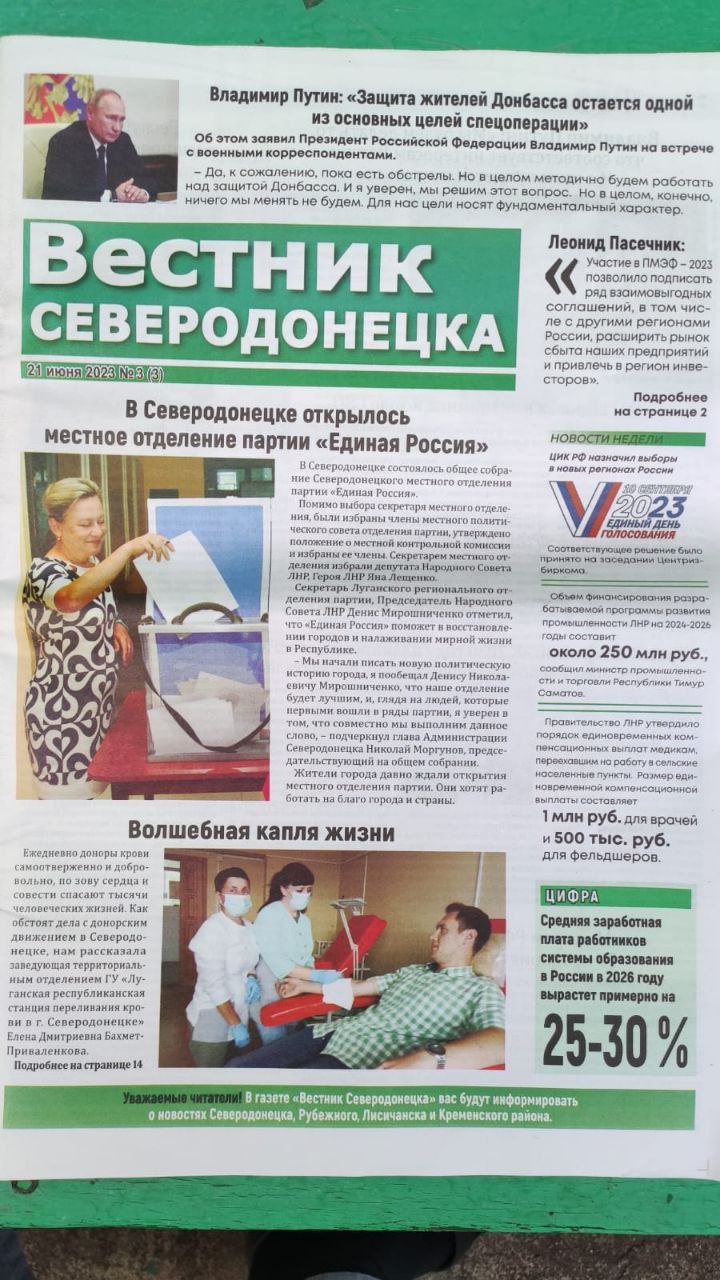 Газета совсем свежая - от 21 июня текущего года. Насколько она затрагивает реальные проблемы города? Очевидно, вообще обходит стороной. На первой полосе газеты, как демонстрирует фото, радостная статья оккупантов о том, что в Северодонецке открылось отделение партии "Единая Россия". Именно его так не хватало в разрушенном россиянами городе.